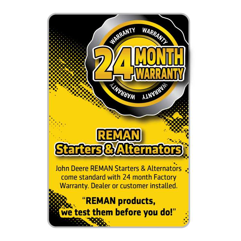 - Warranty and Support: John Deere REMAN Starters and Alternators come with a 24-month warranty from the date of receipt.